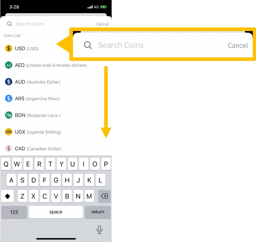 4. Geben Sie die Fiat-Währung in die Suchleiste ein oder scrollen Sie durch die Liste, um Ihre lokale Fiat-Währung auszuwählen.