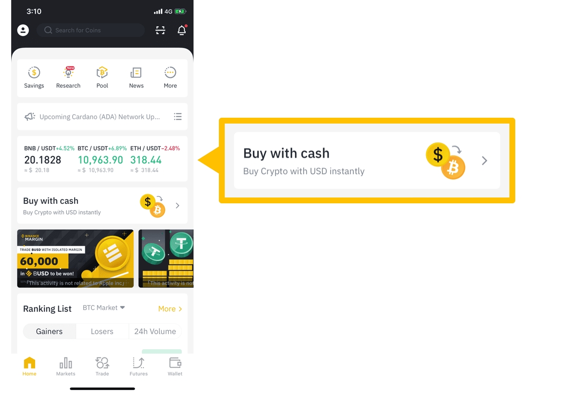 1. Gehen Sie zur Binance Startseite und klicken Sie auf "Buy with cash".