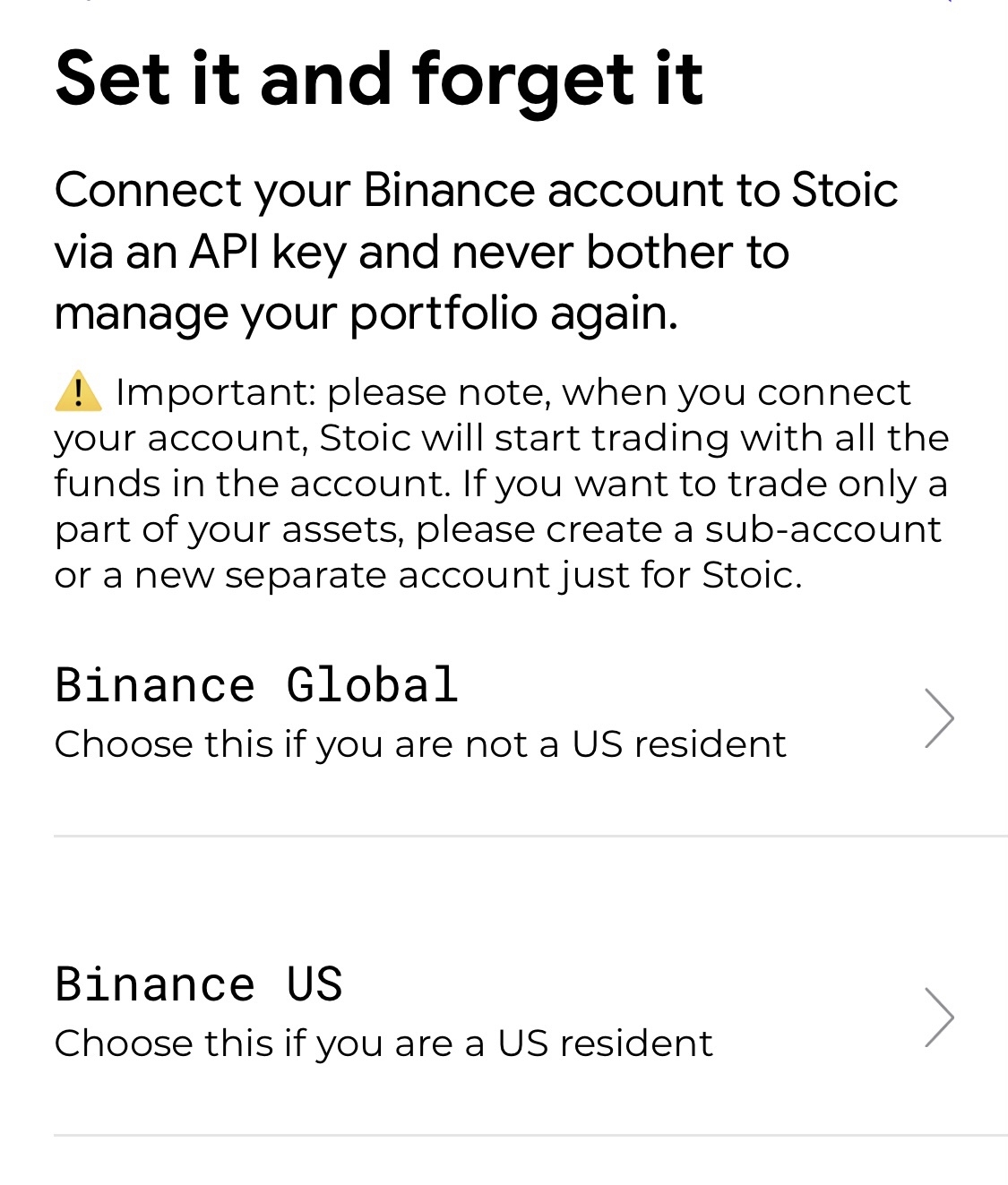 Después de pagar las cuotas, Stoic le pedirá que elija entre Binance Global y Binance US.