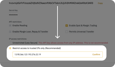 Cuando agrega direcciones IP confiables a Binance, solo Stoic podrá conectarse a su cuenta. Incluso si le revela accidentalmente las llaves a alguien, no podrá hacer nada.