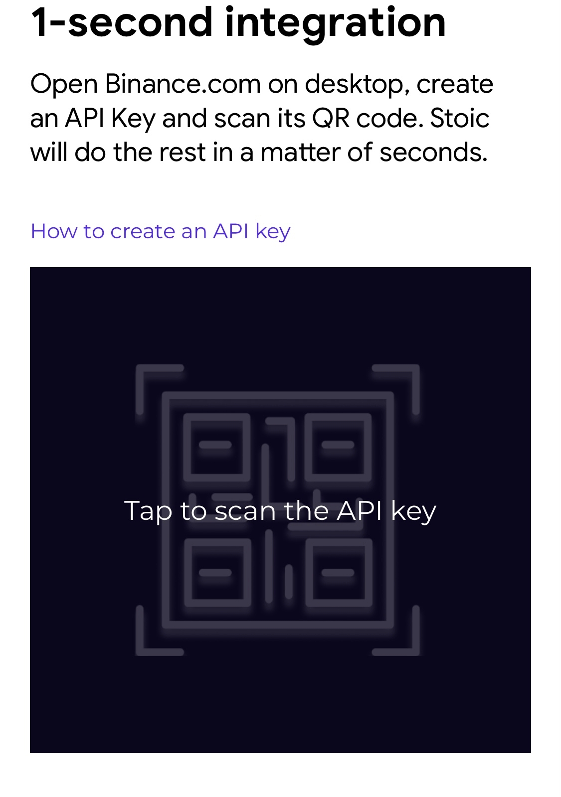 2. Then you will be shown a scan screen to point to the QR-code of your API-keys. You will be connected within seconds.