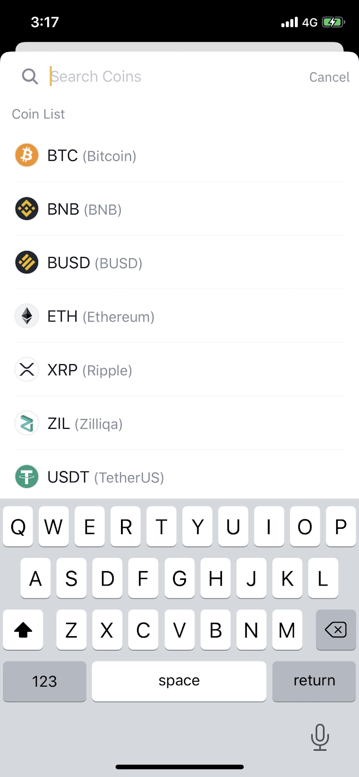 3. Tap [USD] to open the list of supported fiat currencies available